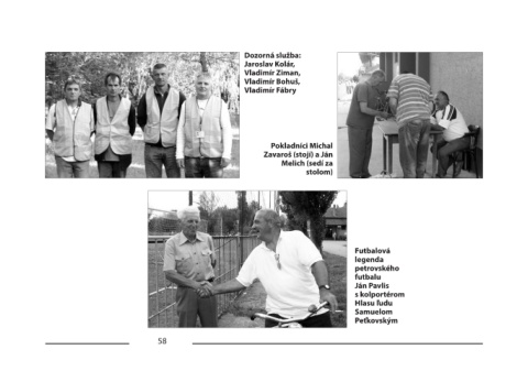 Dozorná služba: Jaroslav Kolár, Vladimír Ziman, Vladimír Bohuš, Vladimír Fábry Pokladníci Michal Zavaroš (stojí) a Ján Melich (sedí za stolom) Futbalová legenda petrovského futbalu Ján Pavlis s kolportérom Hlasu ľudu Samuelom Peťkovským 58