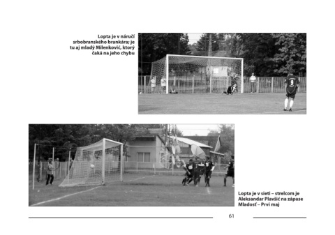 Lopta je v náručí srbobranského brankára; je tu aj mladý Milenković, ktorý čaká na jeho chybu Lopta je v sieti – strelcom je Aleksandar Plavšić na zápase Mladosť – Prvi maj 61