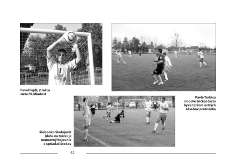 Pavel Fejdi, strážca siete FK Mladosť Pavle Torbica (modré tričko) často býva terčom ostrých zásahov protivníka Slobodan Sladojević (dolu na tráve) je neúnavný bojovník a spriadač útokov 62