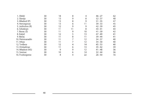 16. Fruškogorac 30 4 4 22 26 : 50 16